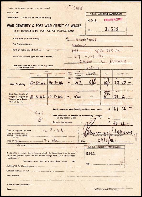 (Demobbed 17 March 1946) - War Gratuity and Post War Credit of Wages
