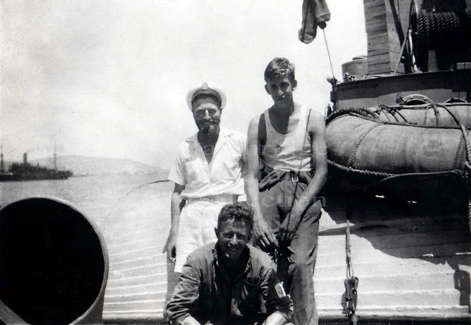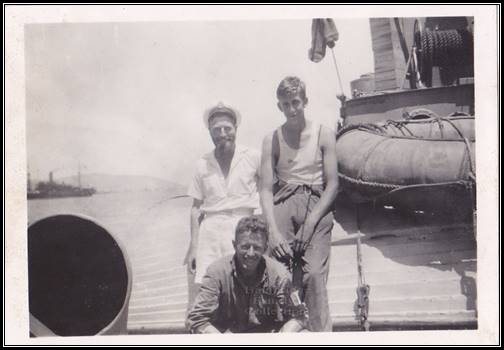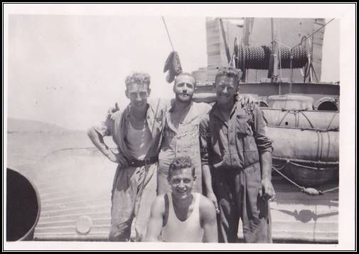 Aboard HMS Scarab Front - Leading Seaman Isaacs Back left - Petty Officer Darby Allen ('Bosun')
