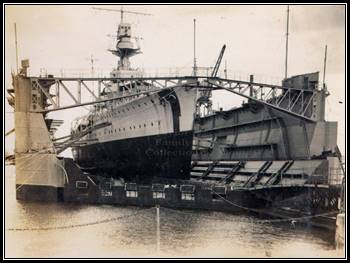 Deammunition was carried out on the 17th, and on the 18th the ship entered the floating dock. Towards the latter part of our last cruise an ominous rudder knock was heard, and an examination in dock revealed that this was due to too much clearance between the pintle and gudgeon. Repairs and refit proceeded apace. Throughout the day, from the depth of the dock, came the noises of scrapers and chipping hammers mingled with lusty voices telling the world about the ‘Stein Song’ and ‘Spring time in the Rockies.’