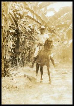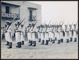 On arrival at our destination we struggled from the motorcars and emerged somewhat dishevelled, for it is not easy to evacuate a motorcar with dignity when wearing a service helmet and a sword and, in the case of the Captain, carrying a colossal wreath. Before we had got really disentangled we found ourselves solemnly walking up a somewhat narrow path, closely followed by the rest of the procession, while on each side was seated a guard of honour of Columbian infantry. As we passed each soldier sprang from his chair, presented arms and resumed his seat. The drill was smart, the guard well turned out, and how wise not to keep a guard standing in the blazing sun in a tropical climate!